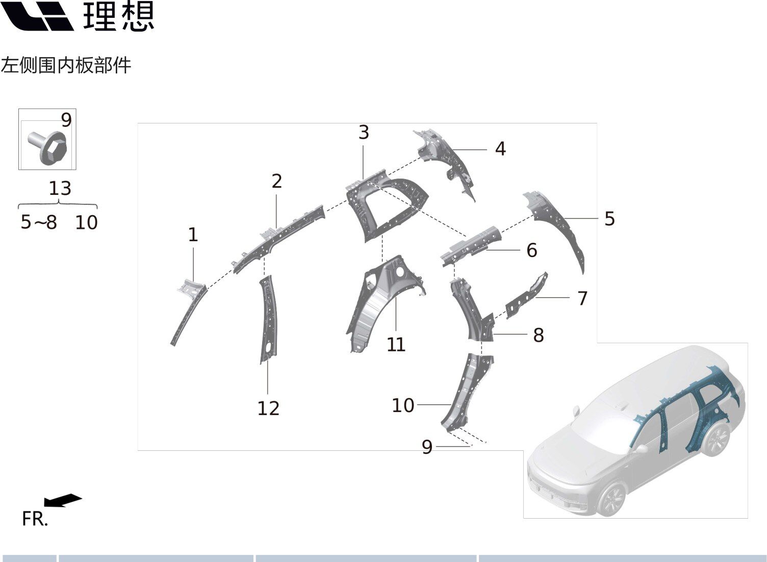 | 9 | 5 | X01-90000219 | левая стойка D верхняя усилительная плита в сборе |